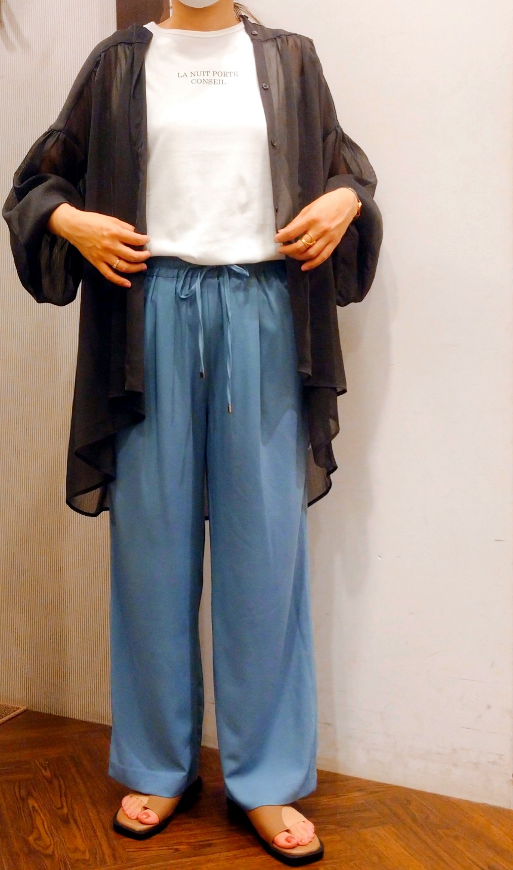 ゆるっとした落ち感と、きれいめの素材感はオンオフで重宝するアイテムです。