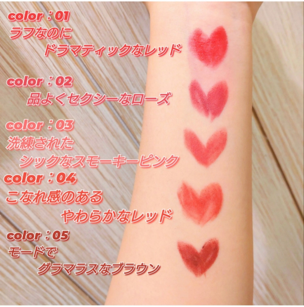 こちらは、パウダーではなくマットタイプのワックスを配合しているため、しっとりとした潤いと、セミマットな質感が両立したリップとなっております👀✨
