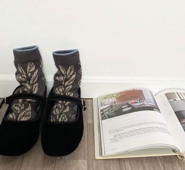 手編みのニット柄のようなチューリップ柄が大胆にフロントに入ったクルーソックス。