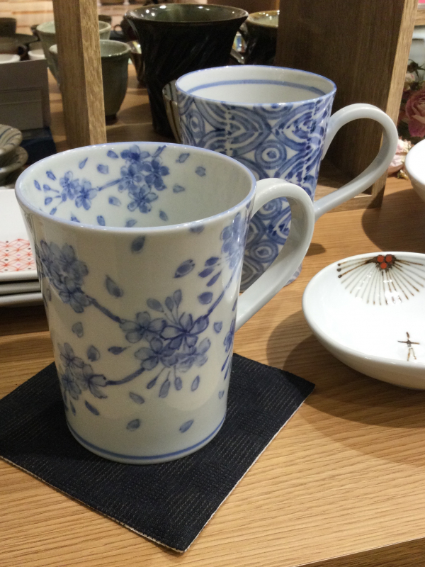 毎日使いたくなるマグカップも色とりどり、染付の青い絵柄もございます。