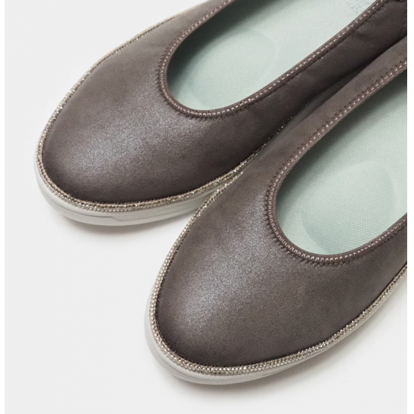 滑らかで上品なラメを配したスエード調のストレッチファブリックと、履き口にエラスティックゴムを入れて足の甲にやさしくフィットする履き心地。